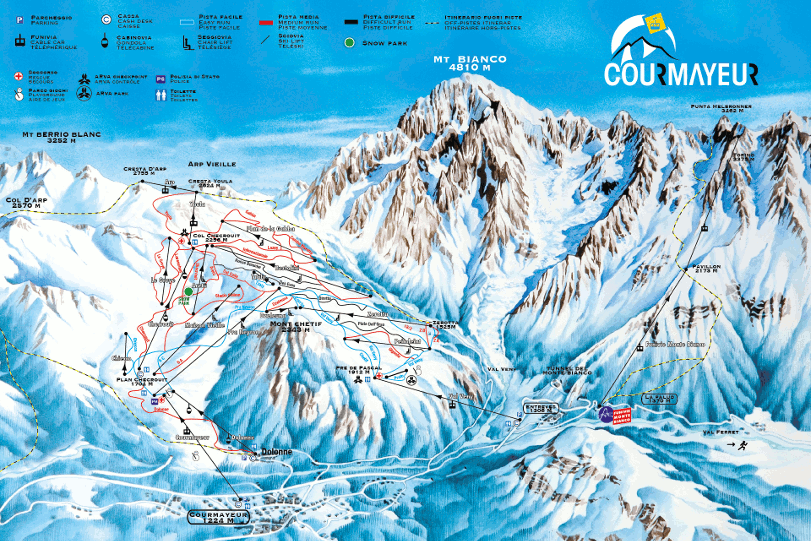 Горнолыжный курорт Курмайор находится в области Валь да Оста, которую иногда называют «поднебесной». Там упираются в небо самые высокие горы Европы – величественный Монблан (4807 м) и Монте – Роза (4634 м). Утопающий в зелени хвойных лесов зимний курорт Курмайор, расположен у подножья Монблана, что дает поистине королевские возможности для катания на горных лыжах.