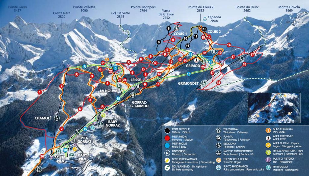 Пила расположена рядом с Аостой, в 125 км. от Турина. Пила связана с Аостой фуникулером. Сама Пила — современный курорт, расположенный прямо на склоне. В Аосте много исторических достопримечательностей, а также магазинов, кафе, ресторанов.